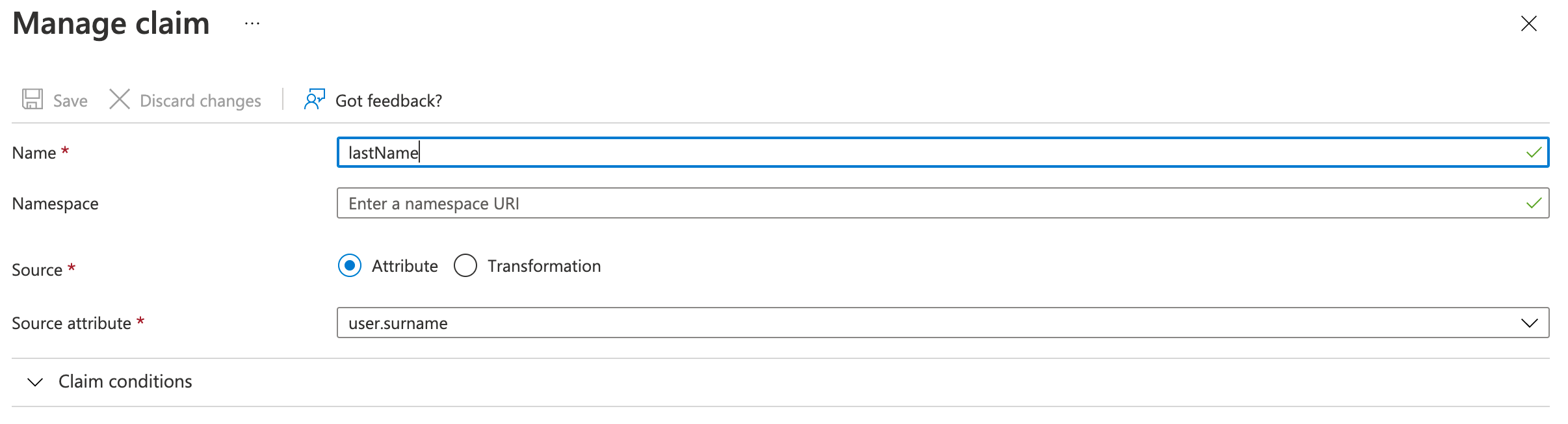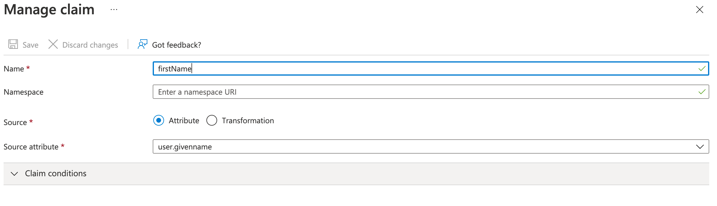 For organizations using Azure Active Directory (AD), do not populate the optional Namespace field for either of the claims (attributes) shown following.
