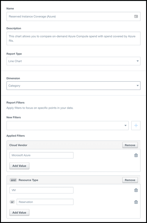 To set up these Azure RI Coverage reports, use a bar chart to see monthly data and a line chart to see daily data. Simply change the report type between bar, line or table to see these variations.