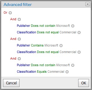 For example, to prepare for a Microsoft audit, you may need to focus on commercial applications published by Microsoft. For the moment, we need to hide these desirable applications while we focus on moving away all the others. Since the advanced filter does not allow for starting a filter with "Not", we need a more complex filter specification to reveal everything except the Microsoft commercial applications:
