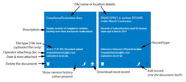 Type | The kind of reference made to the related document (Document upload, File location, Physical location, URL). Set as you create the link to the related document. Tip: You can edit this field when you Edit the document record. For example, you may have started with a reference to a physical document, but now you have scanned the document and want to upload a PDF file to save in the operations database. Simply change the Method of attachment to Document upload, and complete the remaining details to upload your PDF file. |