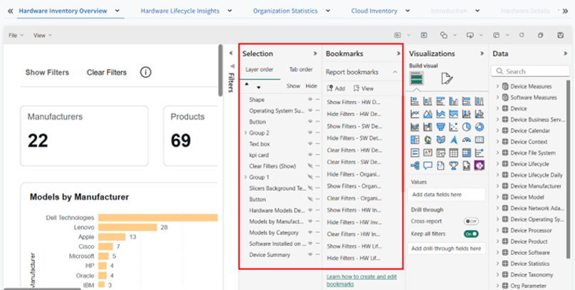 note- By default, the Selection Pane and Bookmarks pane are disabled in the custom reports. You must enable it from Settings to use.